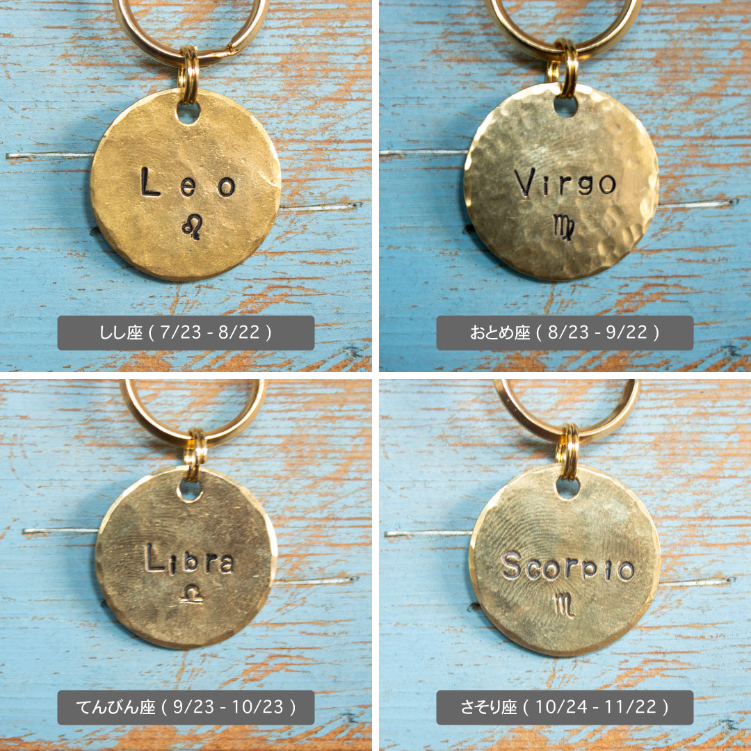 コイン型の真鍮のプレートに12星座などマークやデザインが選べる迷子札。